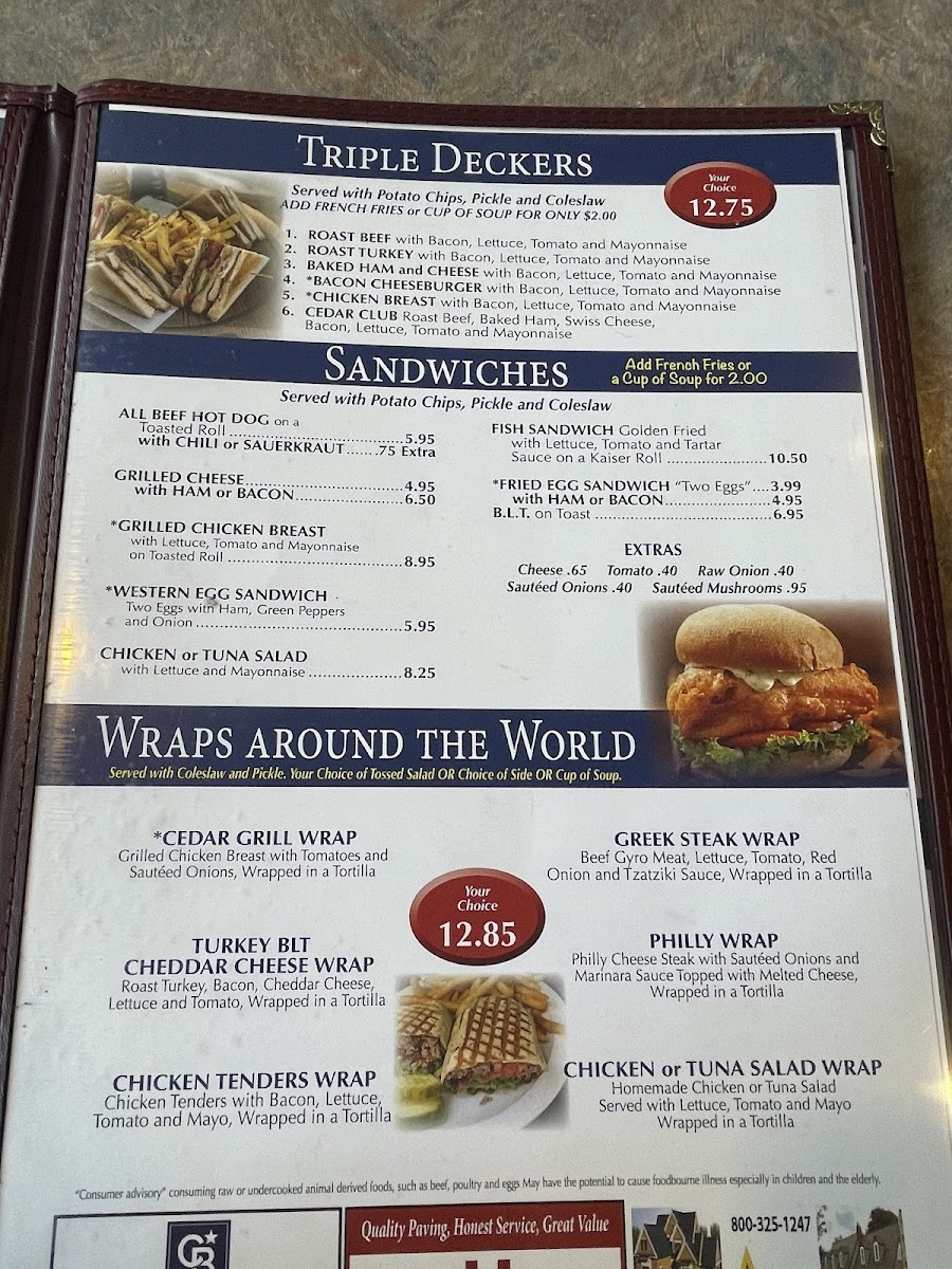 For lunch, the all-day menu shines with enticing options like the Bacon Cheeseburger ($13.95), the hearty Cedar Club ($13.95), and classic sandwiches like the Baked Ham and Cheese ($14.95).